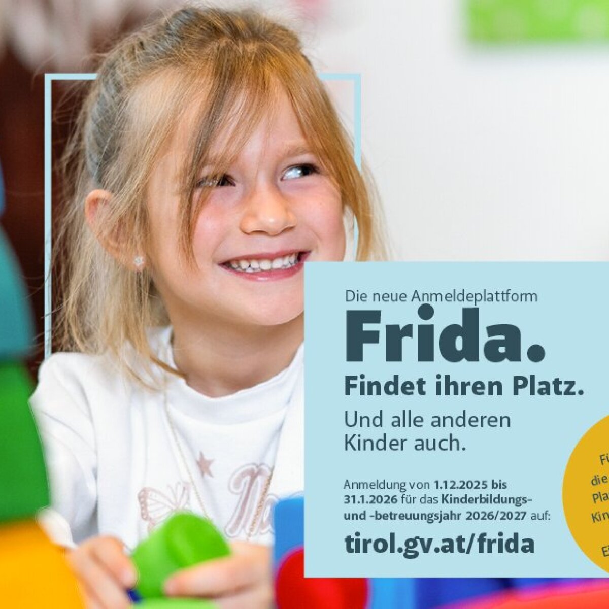 Mit FRIDA wird eine tirolweit einheitliche Anmeldung für Kinderkrippen, Kindergärten und Horte geschaffen. Damit wird die Anmeldung über den Dachverband für das Kinderbildungs- und betreuungsjahr 2026/2027 erstmals zentral, transparent und ausschließlich online abgewickelt. Jedes Kind in Tirol ab dem zweiten Geburtstag soll – wenn ein Platz benötigt wird – in Wohnort- oder Arbeitsplatznähe der Eltern bzw. Erziehungsberechtigten einen geeigneten Kinderbildungs- und Kinderbetreuungsplatz erhalten.